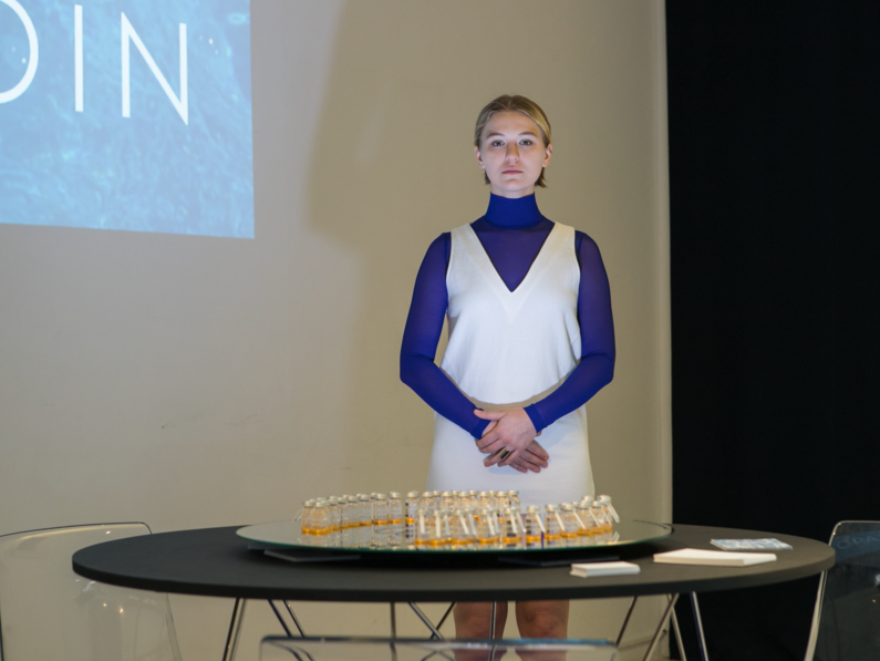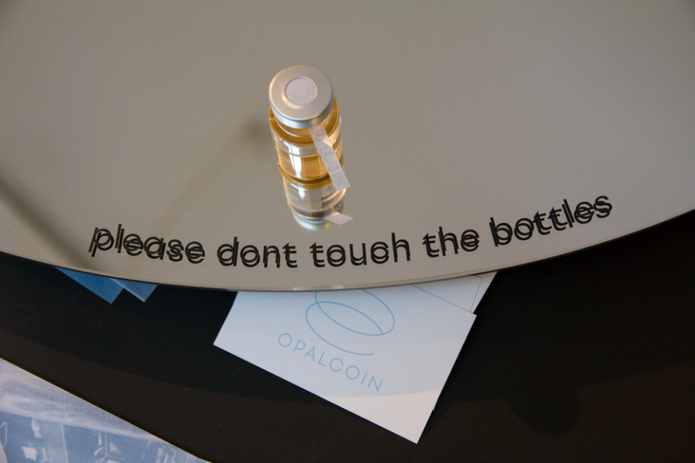 Opalcoin is a fictional product, a designer bottle with a nice logo and merchandise. Inside the bottle, however, is nothing but a transparent hoax. The presentation of the product serves as a commentary on the situation of contemporary capitalism, in which manic and depressive phases alternate like a treadmill. The manic phase is represented by new technological discoveries - perfectly liquid FIAT derivatives, cryptocurrencies defining themselves as the saviours of the system or investment opportunities in self-preservation in the reality of future ecological catastrophe. The depressive phase is represented by the reality of our present - precarization, exploitation, capitalization of public goods, etc.